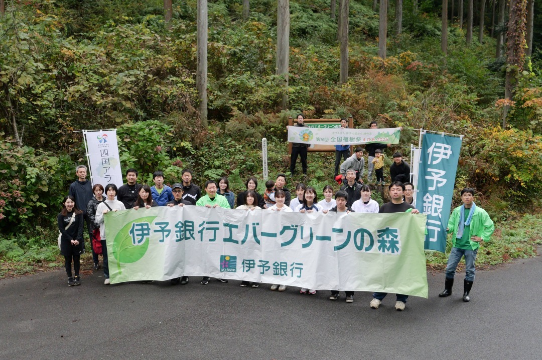愛媛県内4ヵ所で森林づくり活動を行う「伊予銀行エバーグリーンの森」の実施や、「『森のあるまちづくり』をすすめる会」の事務局として累計約56,000本の植樹を行うなど、地域における環境保全活動や緑化活動の企画・運営を行っています。