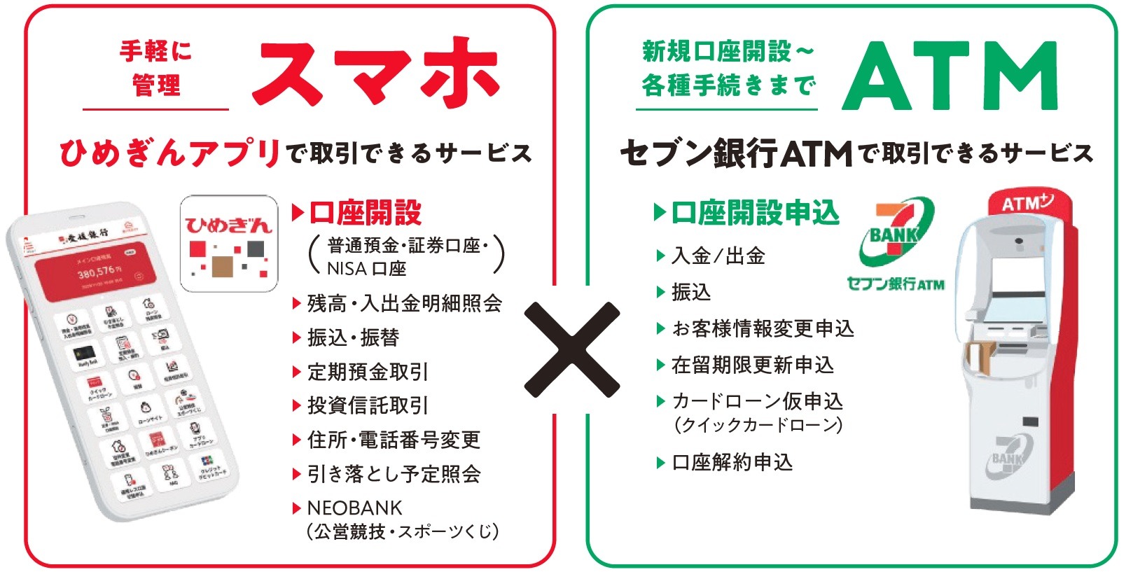 お客さまにとって、いつでも、だれでも、どこでも、便利にお使いいただける、手近な存在を目指し、「ひめぎんアプリ」のデジタルと「セブン銀行ATM」のリアルを掛け合わせたサービスを展開しています。スマホであらゆる銀行機能を完結させられるほか、ペーパーレス化やモビリティに伴うCO2削減などに貢献します。さらに、愛媛の魅力を全国に発信し地元企業を支援します。
