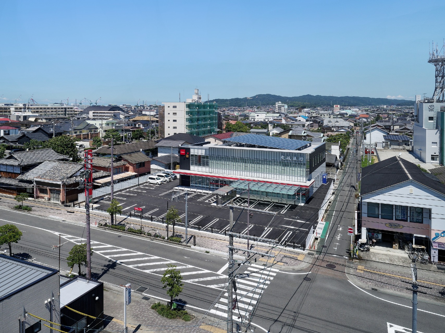 消費エネルギーを実質的にゼロにするZEBの認証を四国の銀行として初めて取得した「西条支店」が、2023年2月に完成し、同年6月にグランドオープンしました。建物のガラスは「水の都・西条」をイメージさせる意匠を施すとともに、断熱効果のある二重構造を採用することで「省エネ」を実現しています。加えて、屋上には太陽光発電パネルを設置し、「創エネ」を行っております。